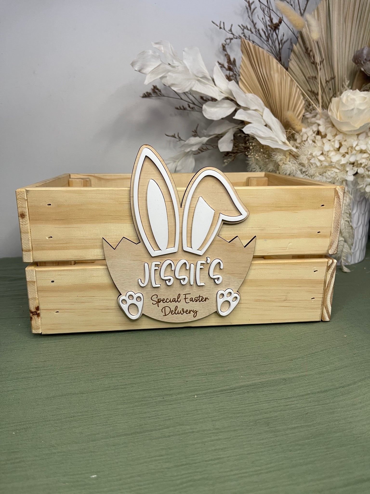 Crafted from solid pine wood with a natural finish, each crate is personalised with any name of your choice, making it a keepsake that can be reused year after year. Sturdy, timeless, and full of charm, our Easter Crates are perfect for gifting, styling your Easter display, or creating a memorable experience for your little ones.